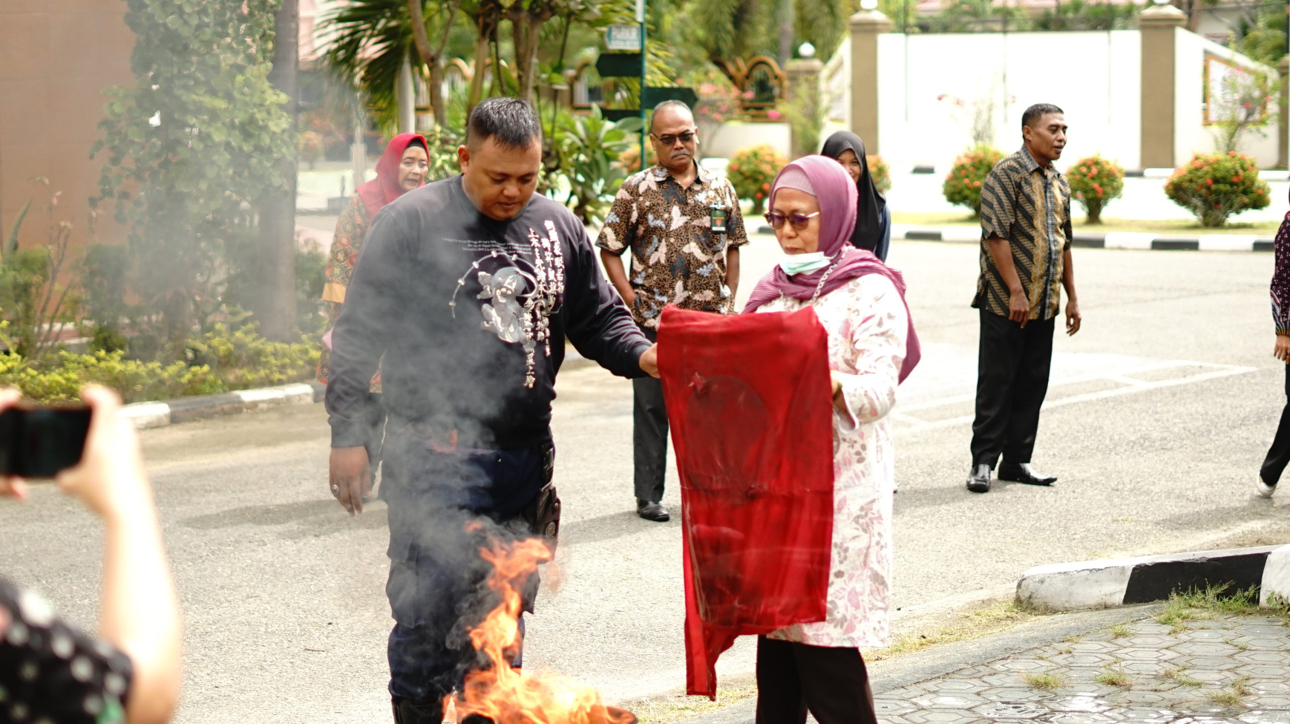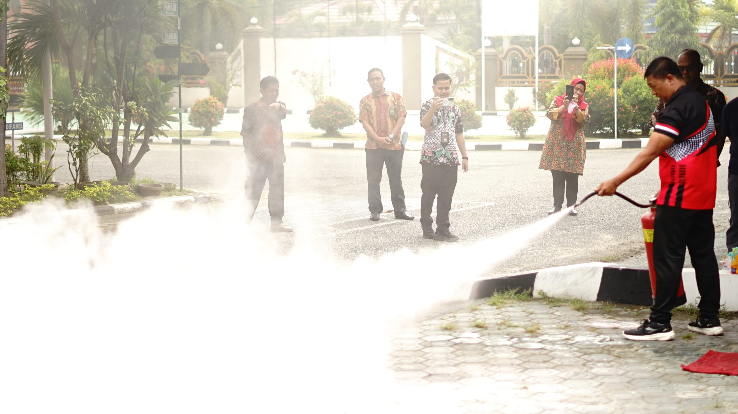 Simulasi tersebut diikuti oleh seluruh keluarga besar Pengadilan Tinggi Gorontalo, antara lain Yang Mulia Ketua Pengadilan Tinggi Gorontalo, Dr. Yapi, S.H., M.H., YM para Hakim Tinggi dan Hakim Ad Hoc Tipikor, Sekretaris, pejabat struktural dan fungsional, serta seluruh ASN. Dalam kegiatan ini, para peserta mempraktikkan cara memadamkan api menggunakan alat pemadam api ringan (APAR) serta cara memadamkan api dengan kain basah sebagai langkah penanganan awal.