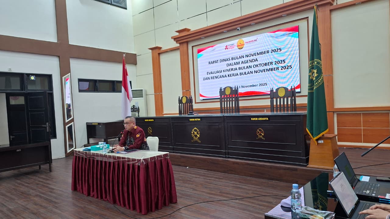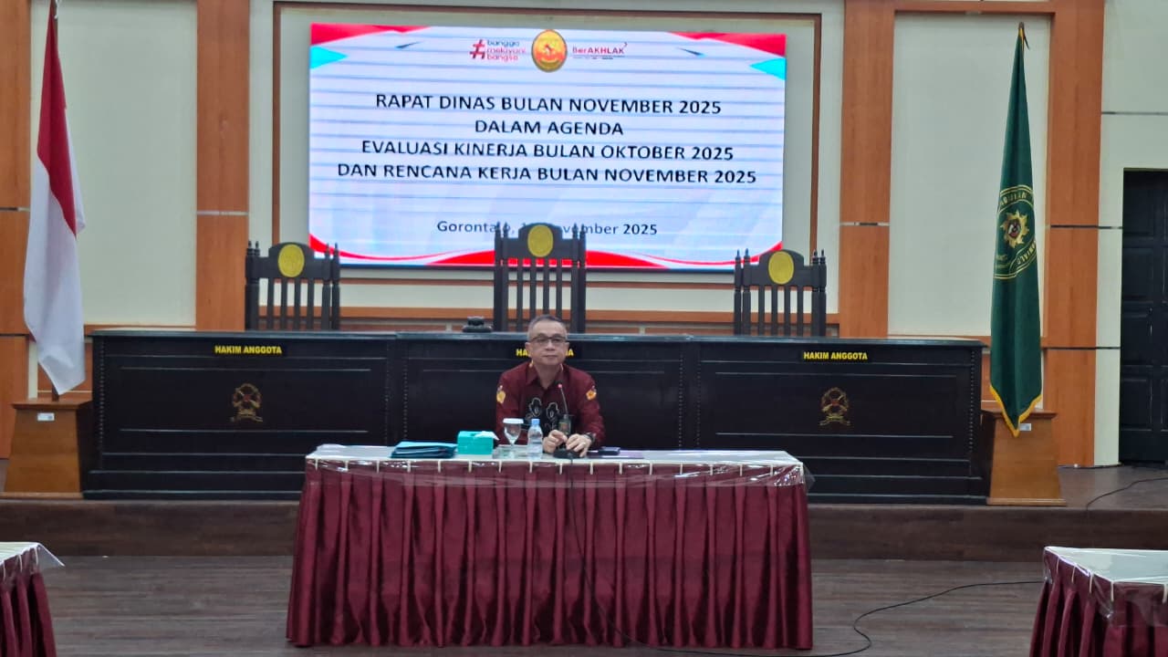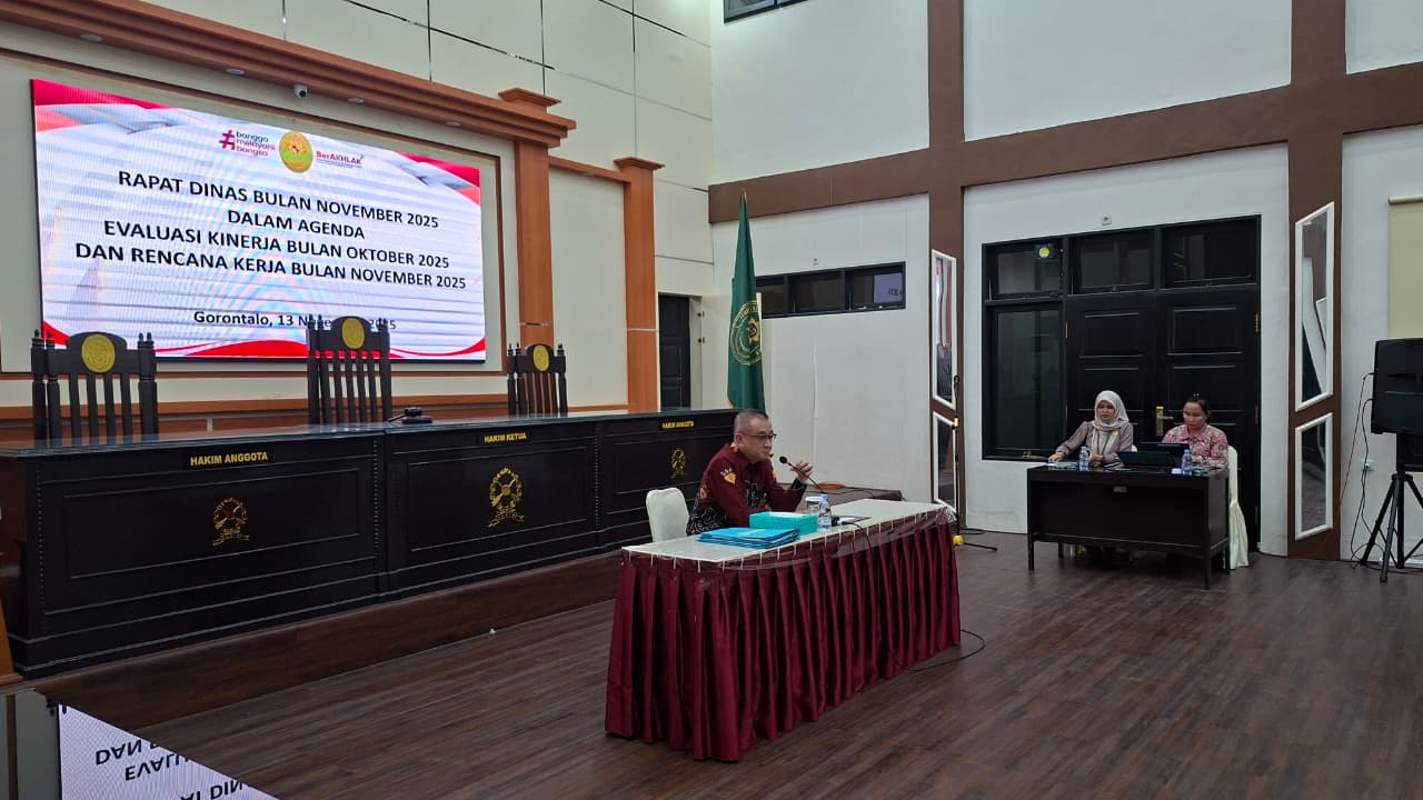 Gorontalo, 14 November 2025 — Pengadilan Tinggi Gorontalo melaksanakan Rapat Dinas Bulan November 2025 pada Kamis, 13 November 2025 pukul 10.30 WITA bertempat di Ruang Sidang Pengadilan Tinggi Gorontalo. Rapat dipimpin langsung oleh Yang Mulia Ketua Pengadilan Tinggi Gorontalo, Dr. Yapi, S.H., M.H.