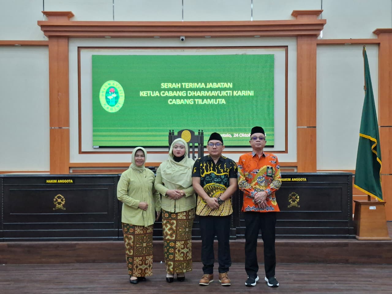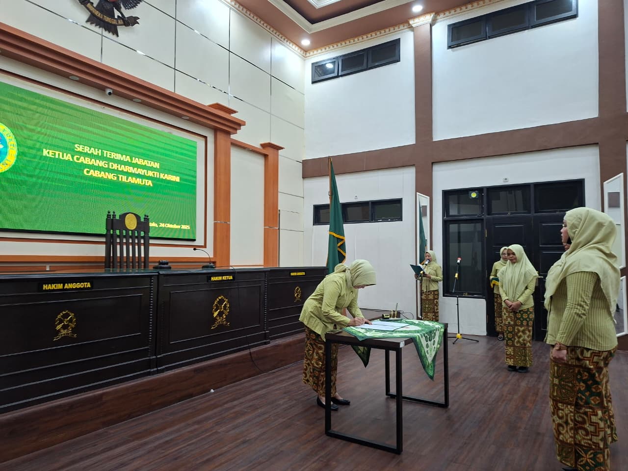 Momen serah terima jabatan ini ditandai dengan penandatanganan Berita Acara Serah Terima Jabatan Ketua Cabang Dharmayukti Karini Tilamuta, yang dilakukan secara berurutan oleh Ketua Cabang yang lama, Ny. Rahmanancy Jayadi Husain, S.E., dilanjutkan oleh Ketua Cabang yang baru, Ny. Kristiana Juliarti Mahendra, S.Psi., dan ditandatangani pula oleh Ketua Daerah Dharmayukti Karini Provinsi Gorontalo, Ny. Dra. Wiwik Tri Wahyuni Yapi.