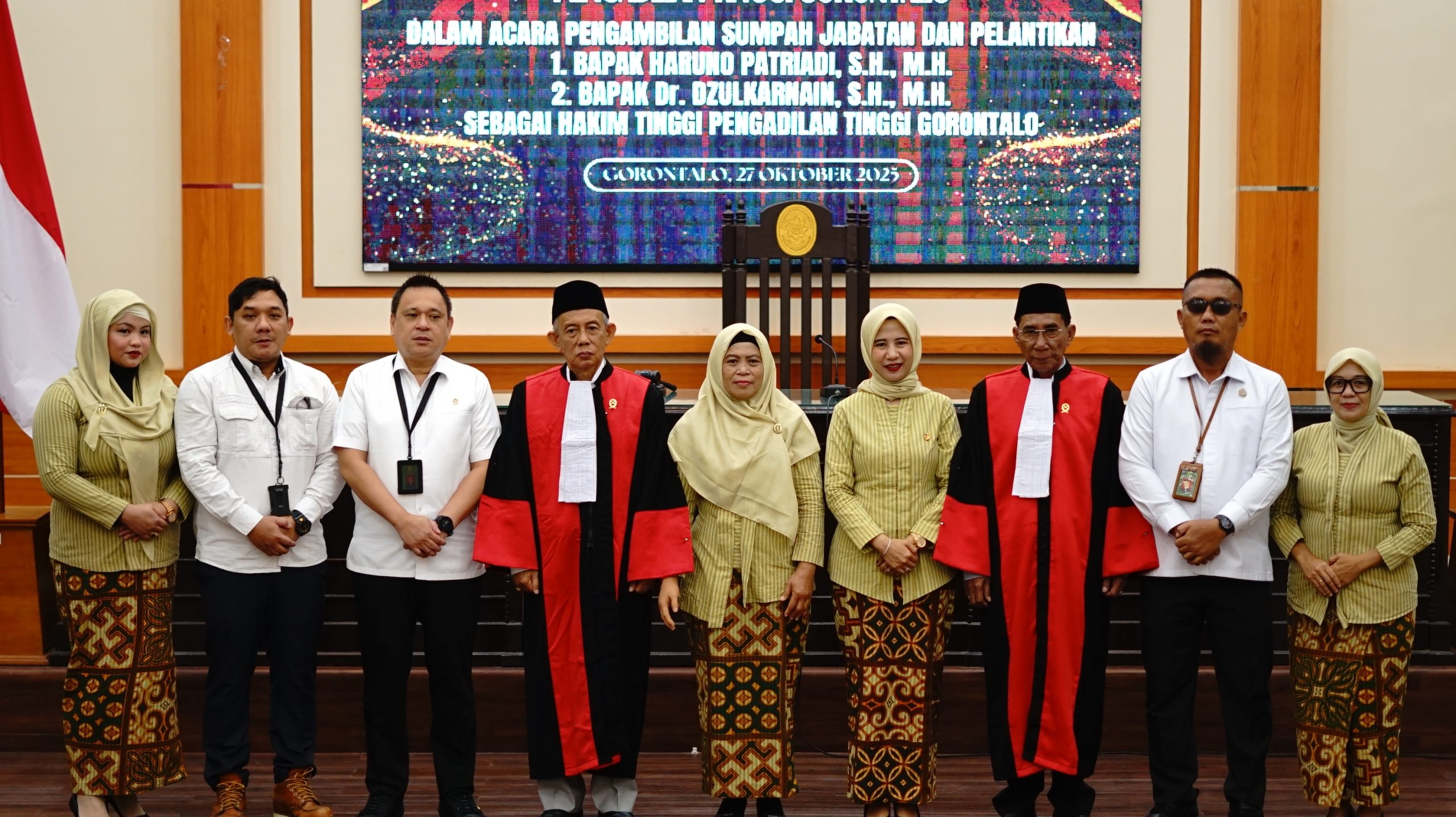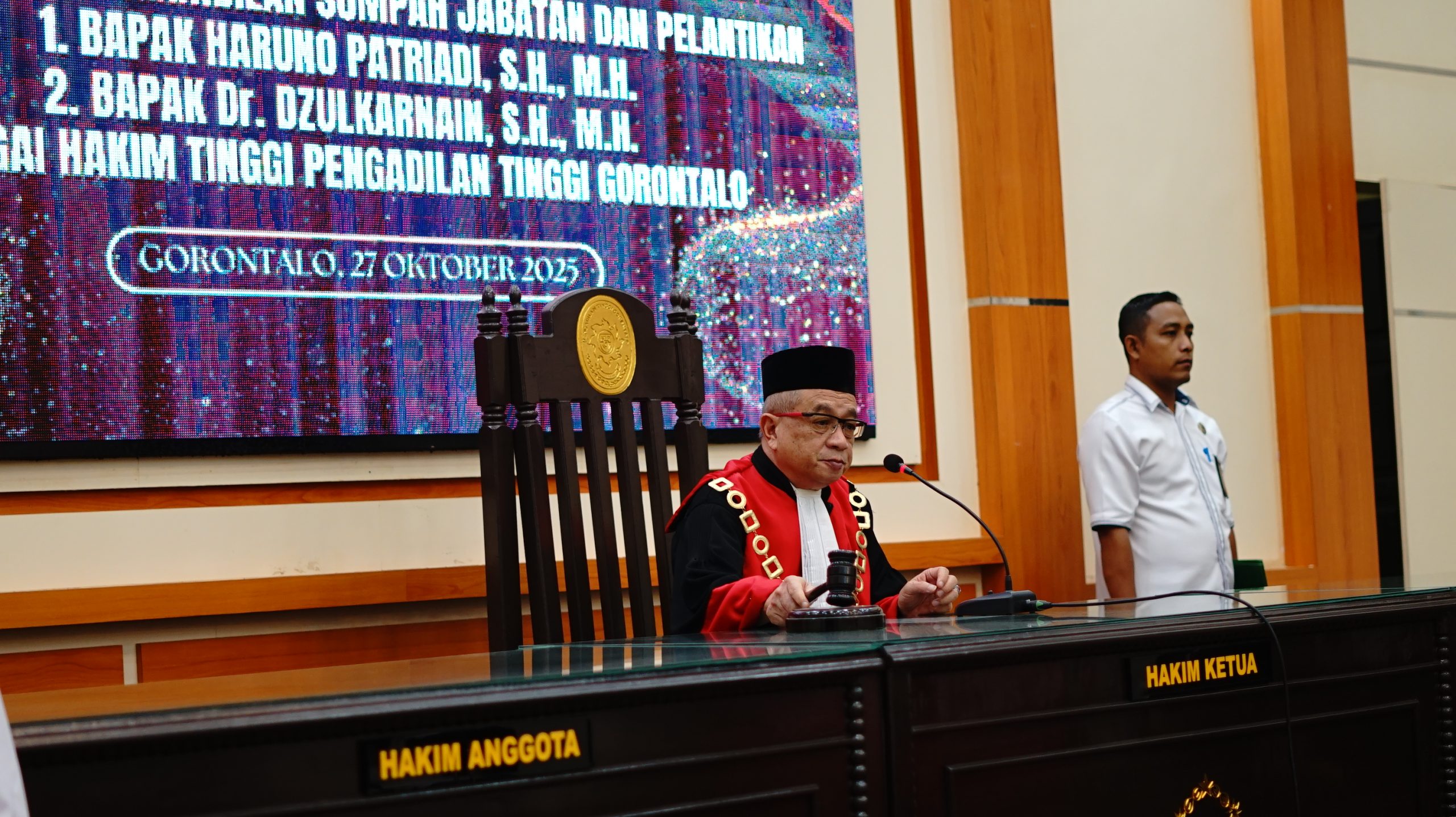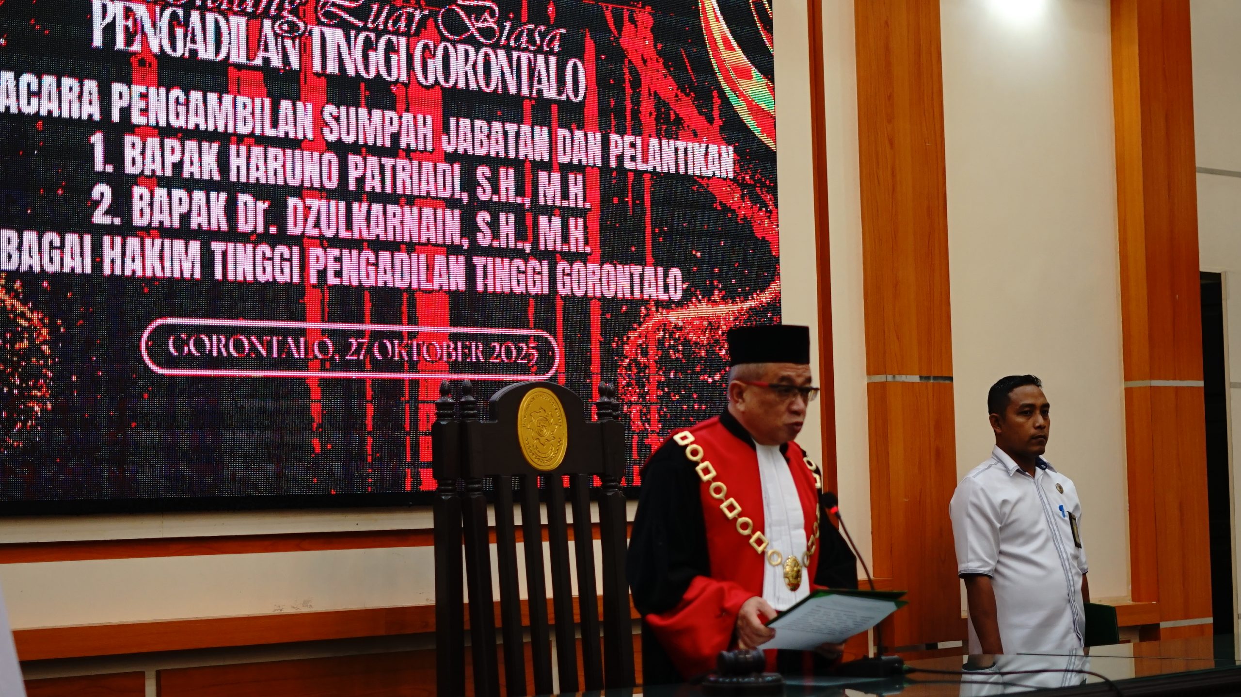 Gorontalo, Senin 27 Oktober 2025 – Pengadilan Tinggi Gorontalo menyelenggarakan Sidang Luar Biasa dalam rangka Pengambilan Sumpah Jabatan dan Pelantikan Hakim Tinggi yang berlangsung pada pukul 10.00 WITA di ruang sidang utama Pengadilan Tinggi Gorontalo.